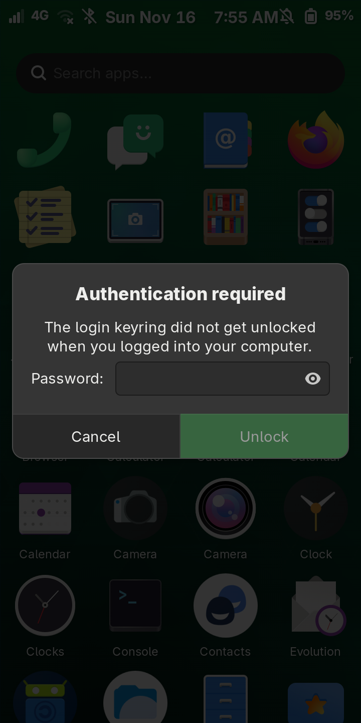 For some reason some apps, notably KeepassXC and Evolution, won't work with the virtual keyboard. This does set a certain limit on being able to "take care of business" as I can't grab passwords from my password manager should the need arise. I can get them via the command line but the exercise of finding the password and getting it into a copy-buffer is not one I wish to do on a regular basis. These work fine with a physical keyboard but I don't always have one on hand.